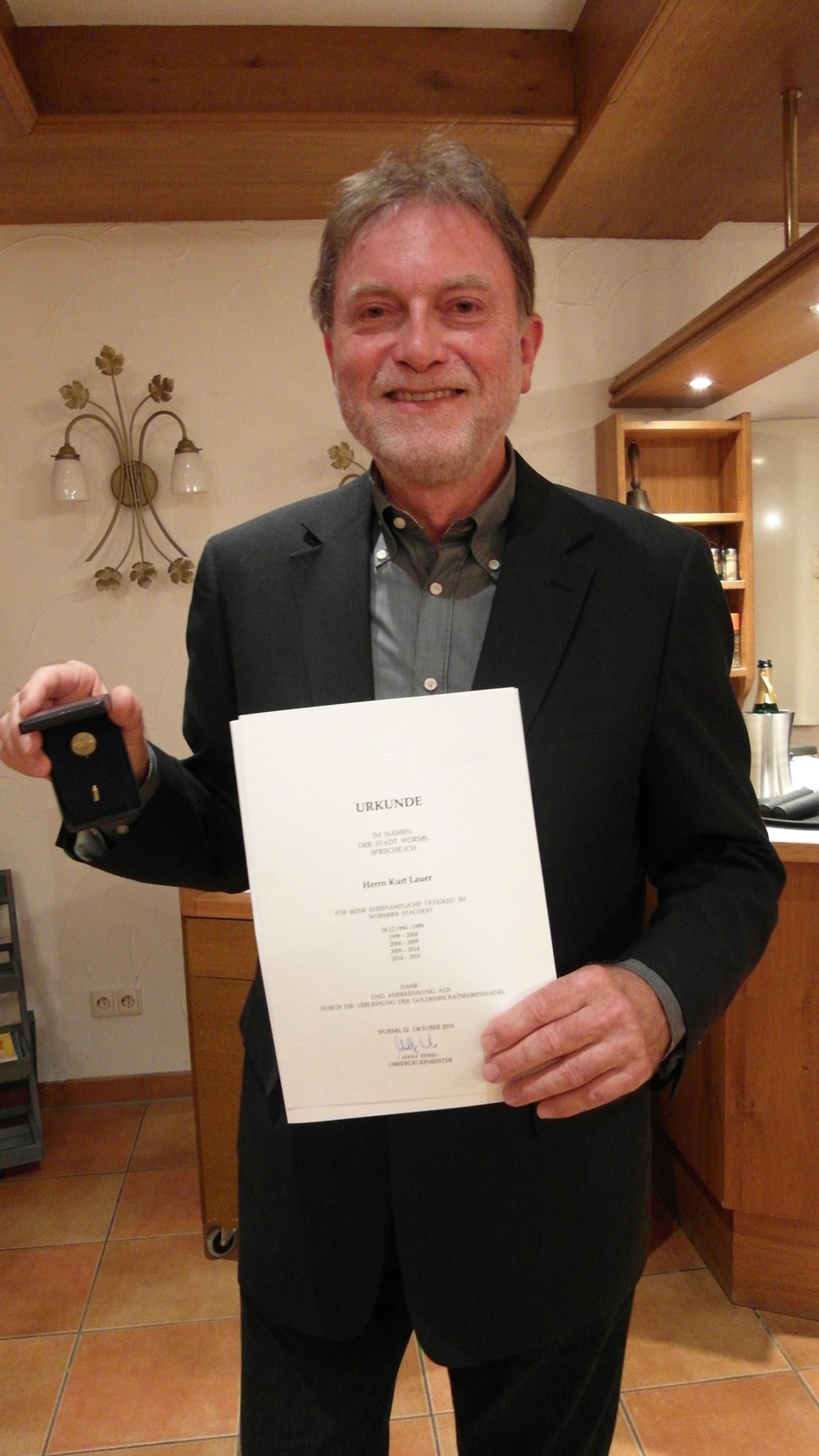 Unser Fraktionskollege Kurt Lauer ist seit 23 Jahren im Wormser Stadtrat. Da er mehr als drei volle Legislaturperioden dem Stadtrat anghört, wurde er in einer Feierstunde von OB Kessel mit der Goldenen Ehrennadel der Stadt Worms ausgezeichnet. Für ihn ist die kommunalpolitische Arbeit ein steter Quell neuen Lernes und neuer Erfahrungen. Ob er bei der nächsten Kommunalwahl wieder kandidieren möchte läßt er offen: Schaun wir mal!