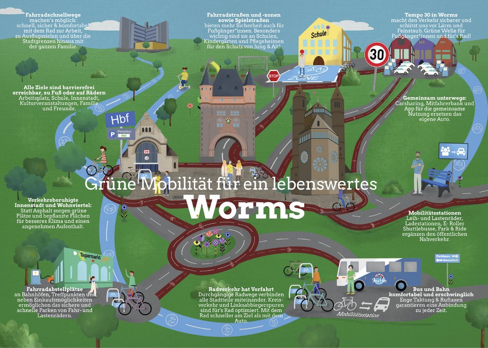 Mobilität in Worms attraktiv, sicher und klimaneutral gestalten - das ist das Ziel der Wormser Grünen. Um das zu erreichen braucht es innovative Konzepte und Ideen. Unser Zukunftsbild soll dir zeigen was wir uns für Worms und die Wormser*innen wünschen.